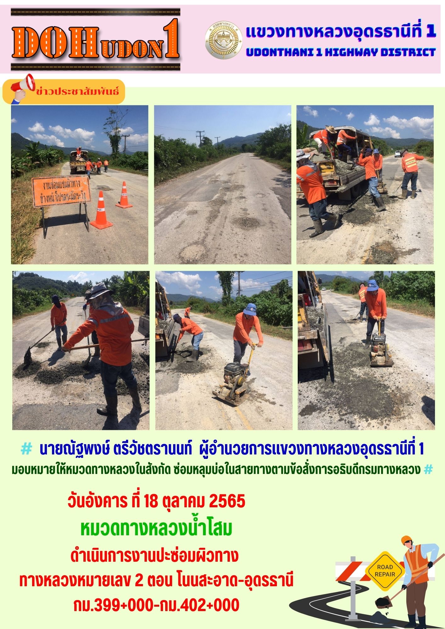 นายณัฐพงษ์ ตรีวัชตรานนท์ ผู้อำนวยการแขวงทางหลวงอุดรธานีที่ 1 มอบหมายให้หมวดทางหลวงในสังกัด ซ่อมหลุมบ่อในสายทางตามข้อสั่งการอธิบดีกรมทางหลวง