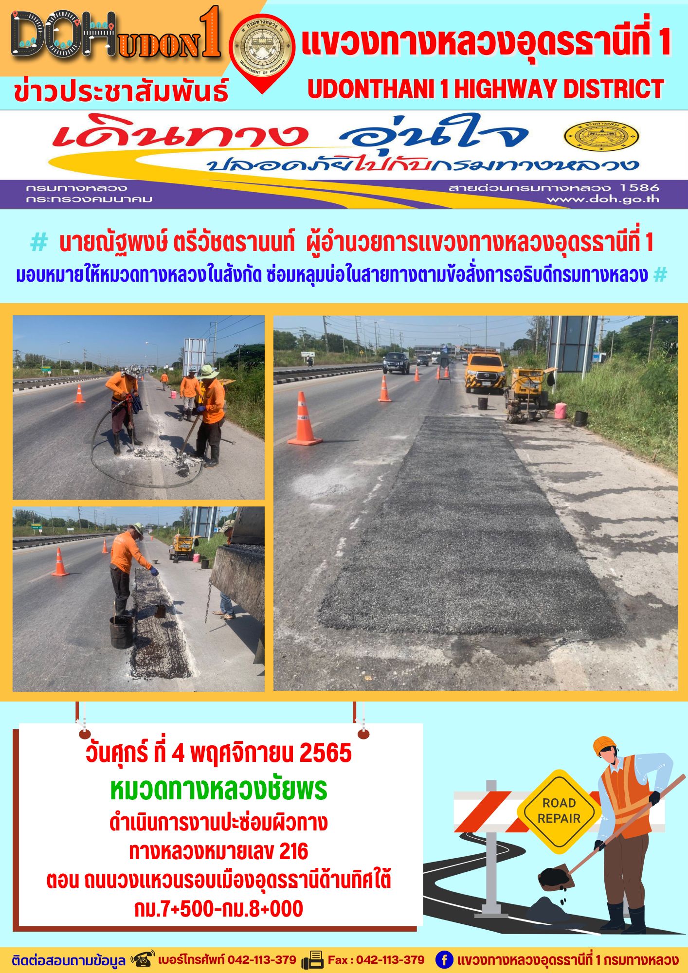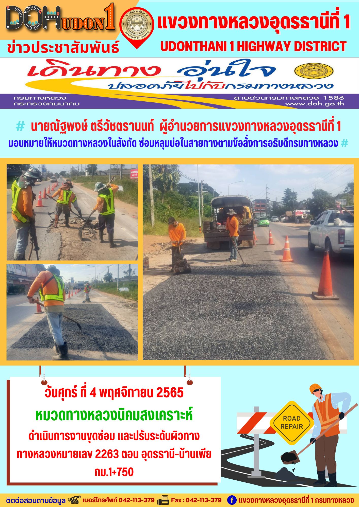 นายณัฐพงษ์ ตรีวัชตรานนท์ ผู้อำนวยการแขวงทางหลวงอุดรธานีที่ 1 มอบหมายให้หมวดทางหลวงในสังกัด ซ่อมหลุมบ่อในสายทางตามข้อสั่งการอธิบดีกรมทางหลวง