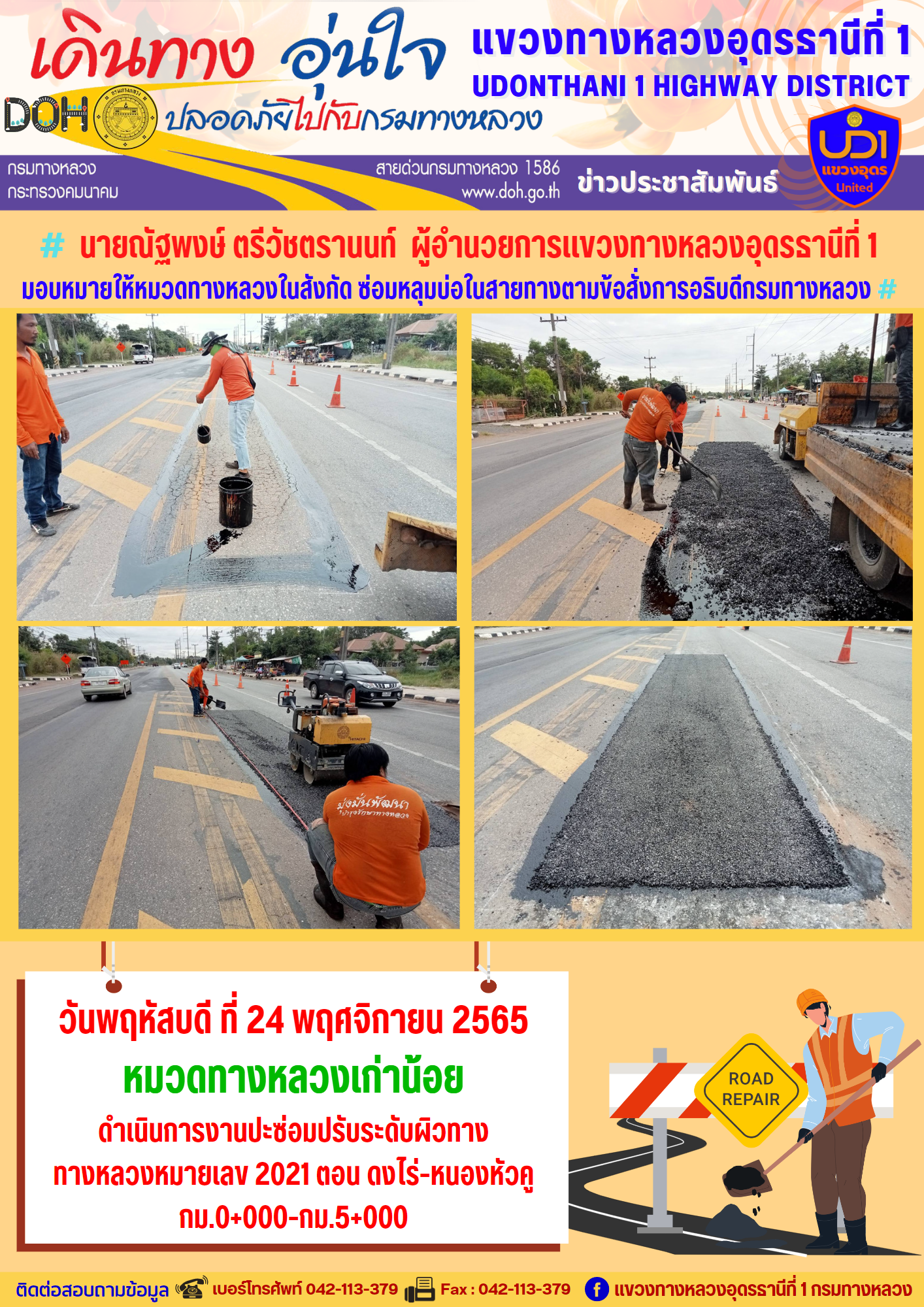 นายณัฐพงษ์ ตรีวัชตรานนท์ ผู้อำนวยการแขวงทางหลวงอุดรธานีที่ 1 มอบหมายให้หมวดทางหลวงในสังกัด ซ่อมหลุมบ่อในสายทางตามข้อสั่งการอธิบดีกรมทางหลวง