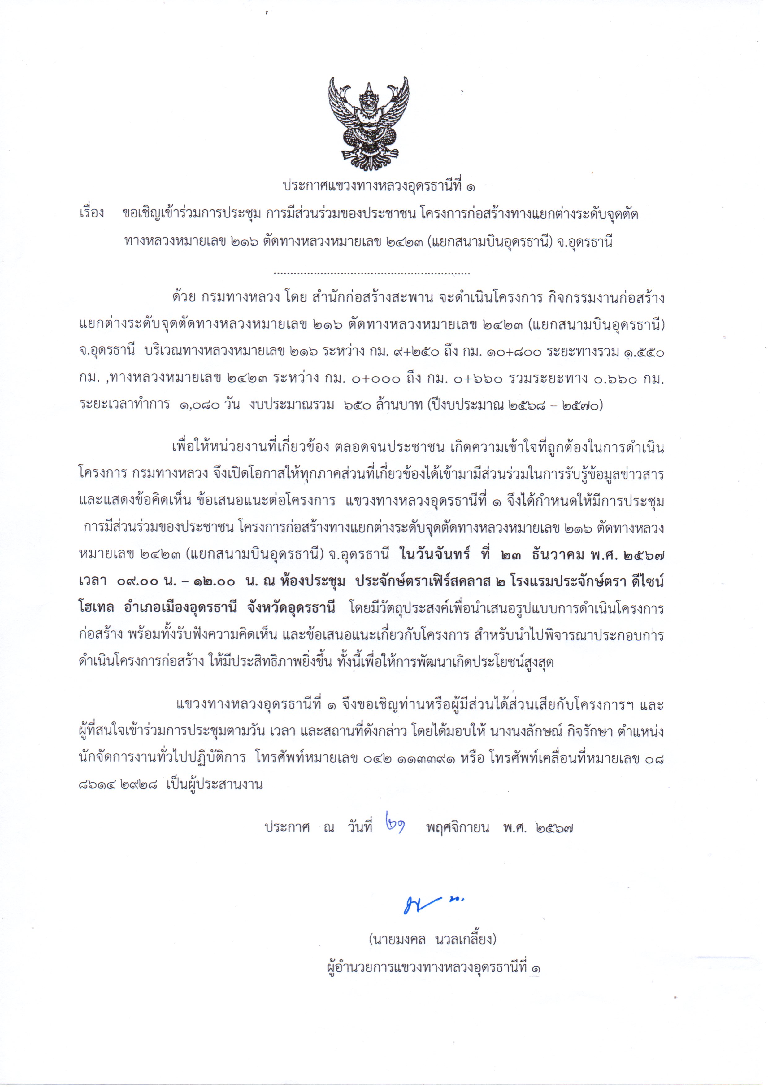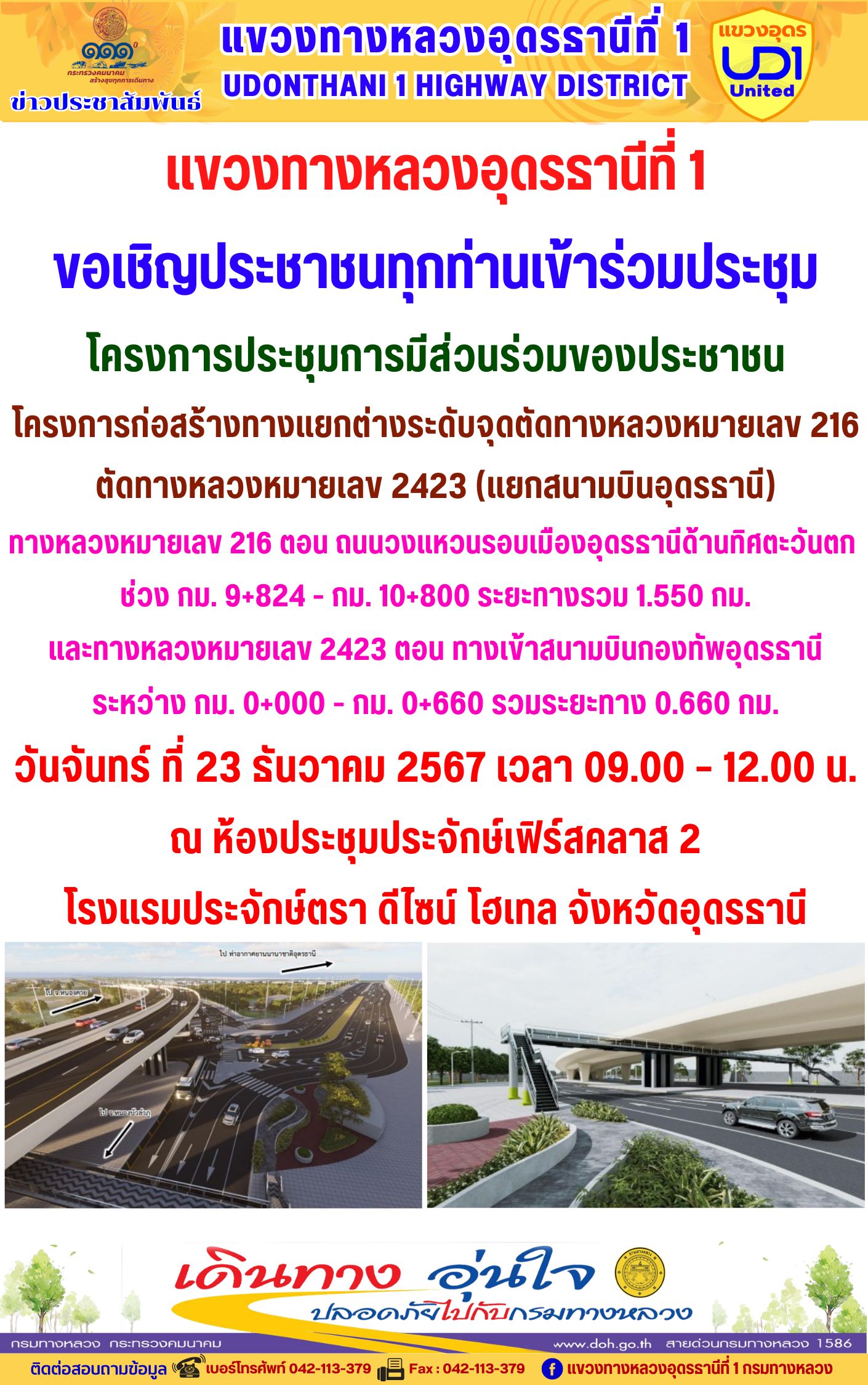แขวงทางหลวงอุดรธานีที่ 1 ขอเชิญประชาชนทุกท่านเข้าร่วมประชุม โครงการประชุมการมีส่วนร่วมของประชาชน โครงการก่อสร้างทางแยกต่างระดับจุดตัดทางหลวงหมายเลข 216 ตัดทางหลวงหมายเลข 2423 (แยกสนามบินอุดรธานี) ทางหลวงหมายเลข 216 ตอน ถนนวงแหวนรอบเมืองอุดรธานีด้านทิศตะวันตก ช่วง กม. 9+824 - กม. 10+800 ระยะทางรวม 1.550 กม. และทางหลวงหมายเลข 2423 ตอน ทางเข้าสนามบินกองทัพอุดรธานี ระหว่าง กม. 0+000 - กม. 0+660 รวมระยะทาง 0.660 กม. วันจันทร์ ที่ 23 ธันวาคม 2567 เวลา 09.00 – 12.00 น. ณ ห้องประชุมประจักษ์เฟิร์สคลาส 2 โรงแรมประจักษ์ตรา ดีไซน์ โฮเทล จังหวัดอุดรธานี