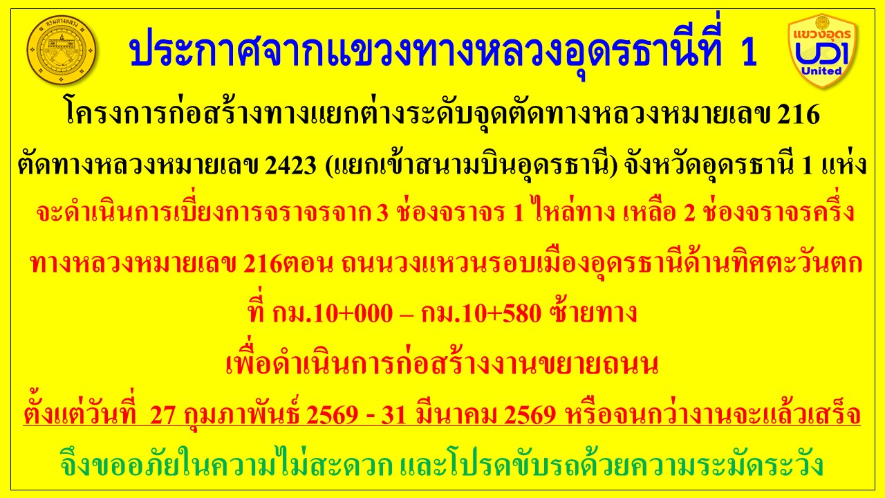 ประกาศจากแขวงทางหลวงอุดรธานีที่ 1 ประกาศจากแขวงทางหลวงอุดรธานีที่ 1 โครงการก่อสร้างทางแยกต่างระดับจุดตัดทางหลวงหมายเลข 216 ตัดทางหลวงหมายเลข 2423 (แยกเข้าสนามบินอุดรธานี) จังหวัดอุดรธานี 1 แห่ง
