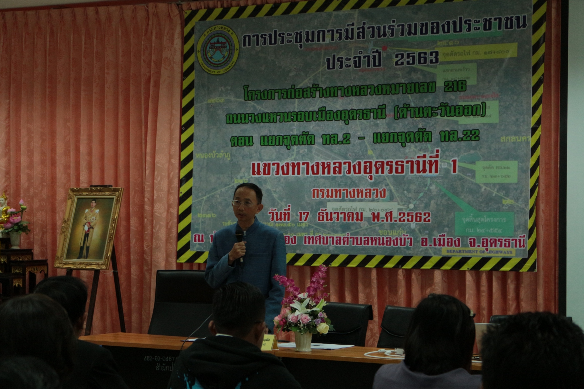วันที่ 17 ธันวาคม 2562 เวลา 09.00 น. แขวงทางหลวงอุดรธานีที่ 1 ดำเนินการจัดการประชุมการมีส่วนร่วมของประชาชน ปี 2563 โครงการก่อสร้างทางหลวงหมายเลข 216 ถนนวงแหวนรอบเมืองอุดรธานี (ด้านทิศตะวันออก) ตอน แยกจุดตัด ทางหลวงหมายเลข 2 - ทางหลวงหมายเลข 22 ณ ห้องประชุมโพนทอง เทศบาลตำบลหนองบัว อ.เมือง จ.อุดรธานี โดยมีรองผู้ว่าราชการจังหวัดอุดรธานี นายกองเอกปราโมทย์ ธัญญพืช เป็นประธานในพิธี วิทยากรบรรยายโครงการโดย นายกฤษดา ผดุงขันธ์ วิศวกรโยธาชำนาญการ สำนักสำรวจและออกแบบ กรมทางหลวง ผู้เข้าร่วมประชุมเป็นผู้เกี่ยวข้องและมีส่วนได้เสียในพื้นที่ก่อสร้าง ประมาณ 150 คน